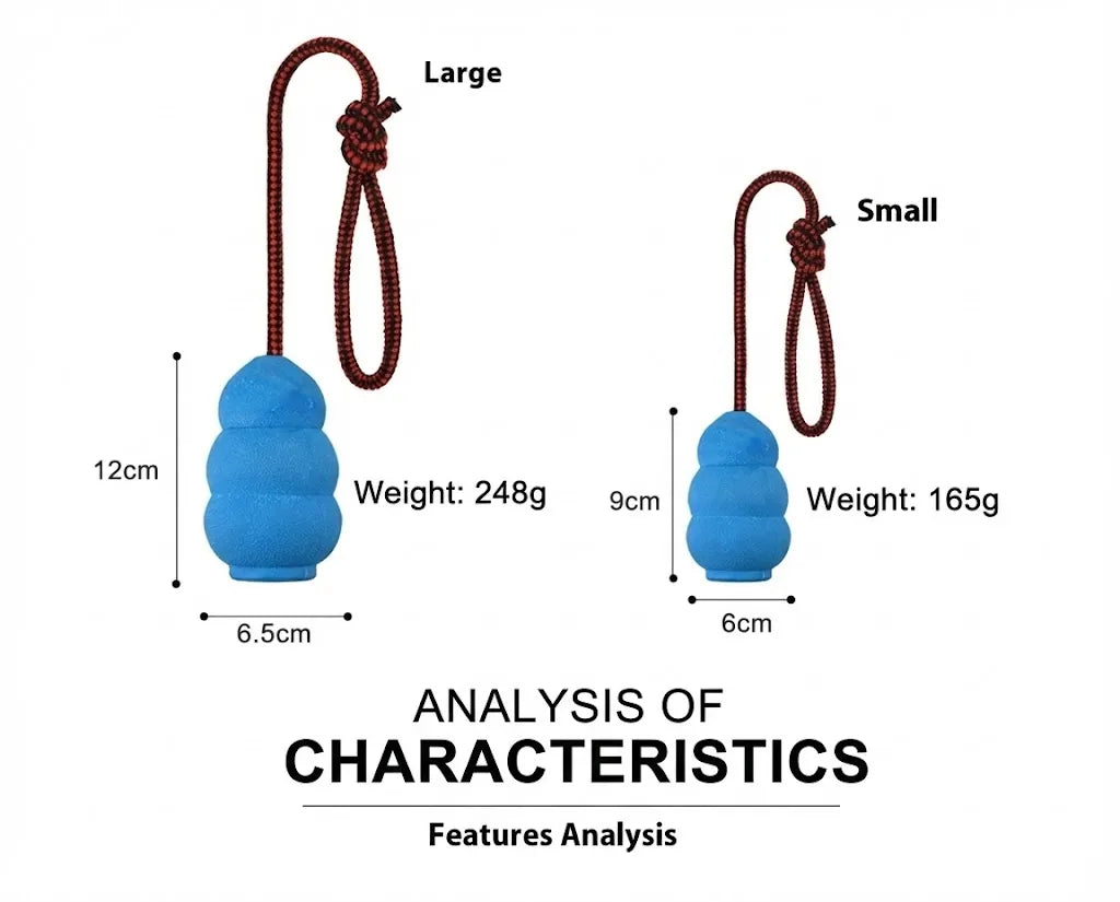What is the Natural Rubber Rope Hoist Toy? This is a high-energy interactive dog toy designed for tug-of-war and long-distance fetch. It combines a durable natural rubber body (safe for chewing) with a strong rope handle. The rope allows owners to throw the toy much further than a standard ball by using centrifugal force, while also providing a safe grip for playing tug games without getting your hands near the dog's mouth.