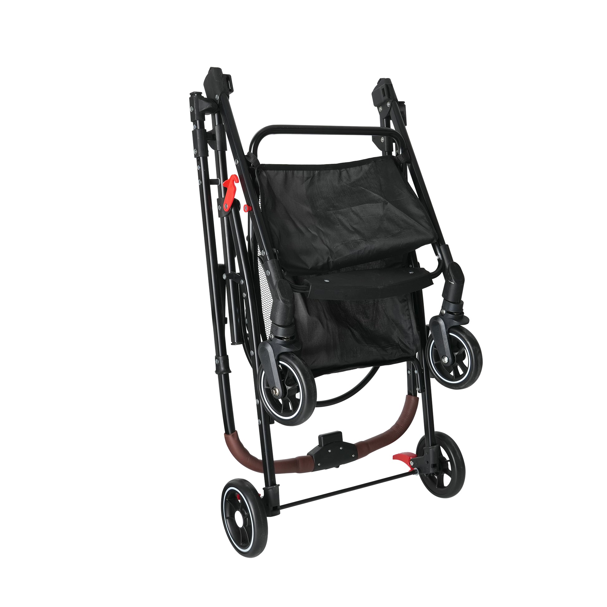- 360° Rotating Wheels: The front wheels swivel fully to navigate tight corners and crowds easily, while rear brakes ensure safety when stopped.